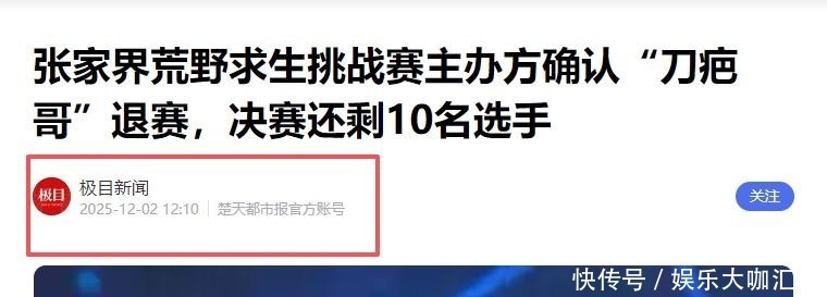 128. 【参考文献】1.极目新闻-2025日——《张家界七星山荒野求生决赛:人气选手“刀疤哥”因肠胃不适主动退赛》2.潮新闻-2025月——《荒野求生选手刀疤哥退赛引发争议》3.荒野刀疤哥个人社交账号-2025日——《关于退赛原因的说明》